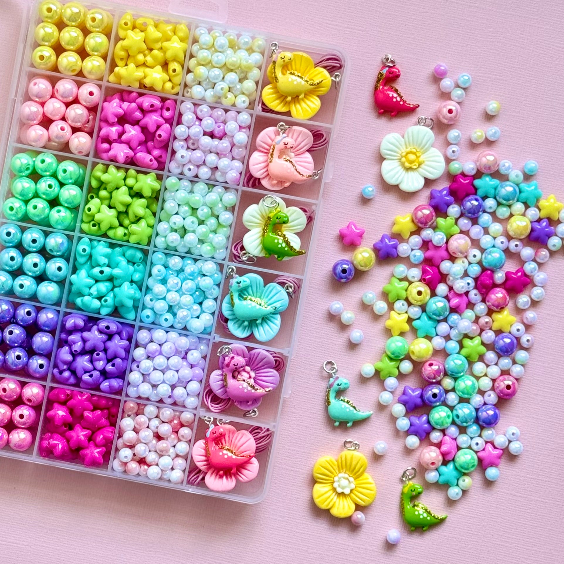 Each kit comes with over 430 x mixed 8 - 10mm beads, beading elastic and 6 x dinosaur charms, 6 x flower charms all packed into a rectangle storage container